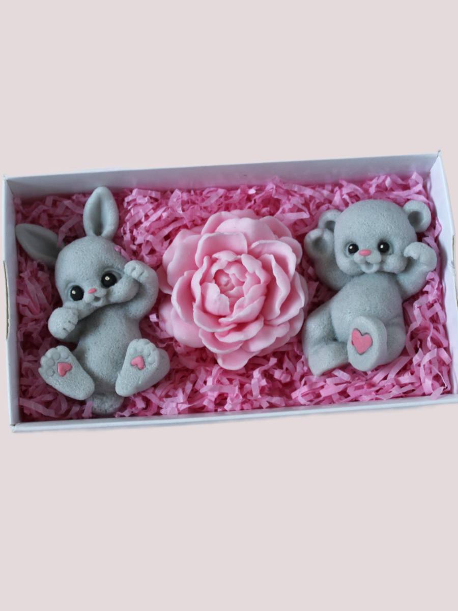 מארז סבון "באני ובראוני אפורים עם פרח" – עשוי בעבודת יד מסבון איכותי ועדין, עם קצף רך וריח נעים. ניתן להשתמש בו כמו סבון ידיים רגיל או כריחן לחדר.